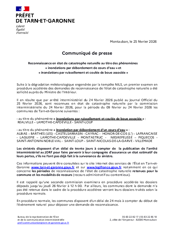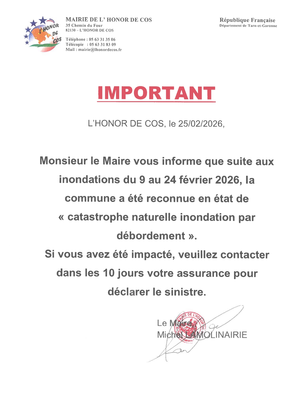 IMPORTANT : Monsieur le maire vous informe que suite aux inondations du 9 au 24 février 2026, la commune a été reconnue en état de catastrophe...