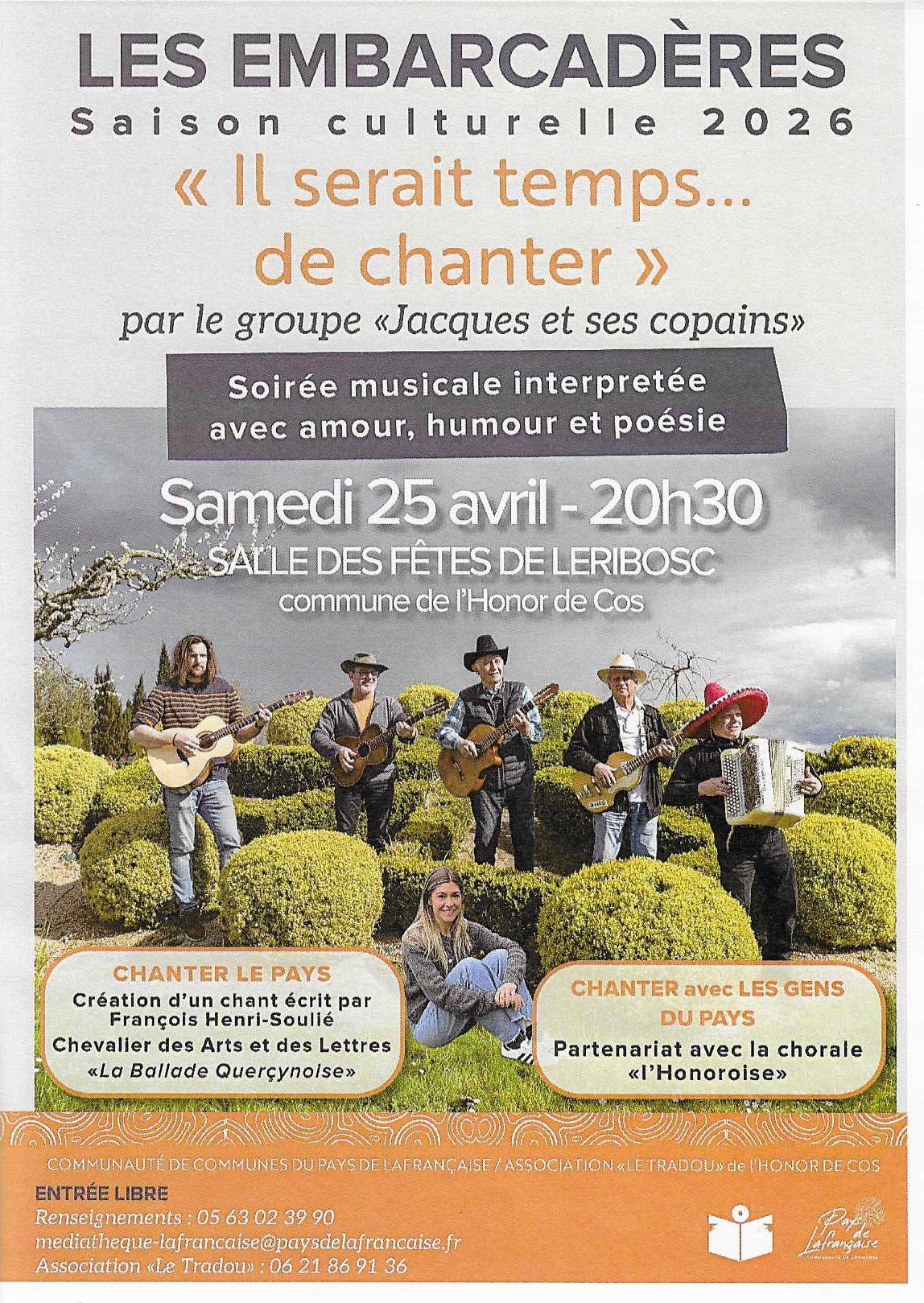 Rendez-vous le samedi 25 avril à 20h30 à la salle des fêtes de Léribosc où le groupe "Jacques et ses copains"nous régaleront d'une soirée musicale...
