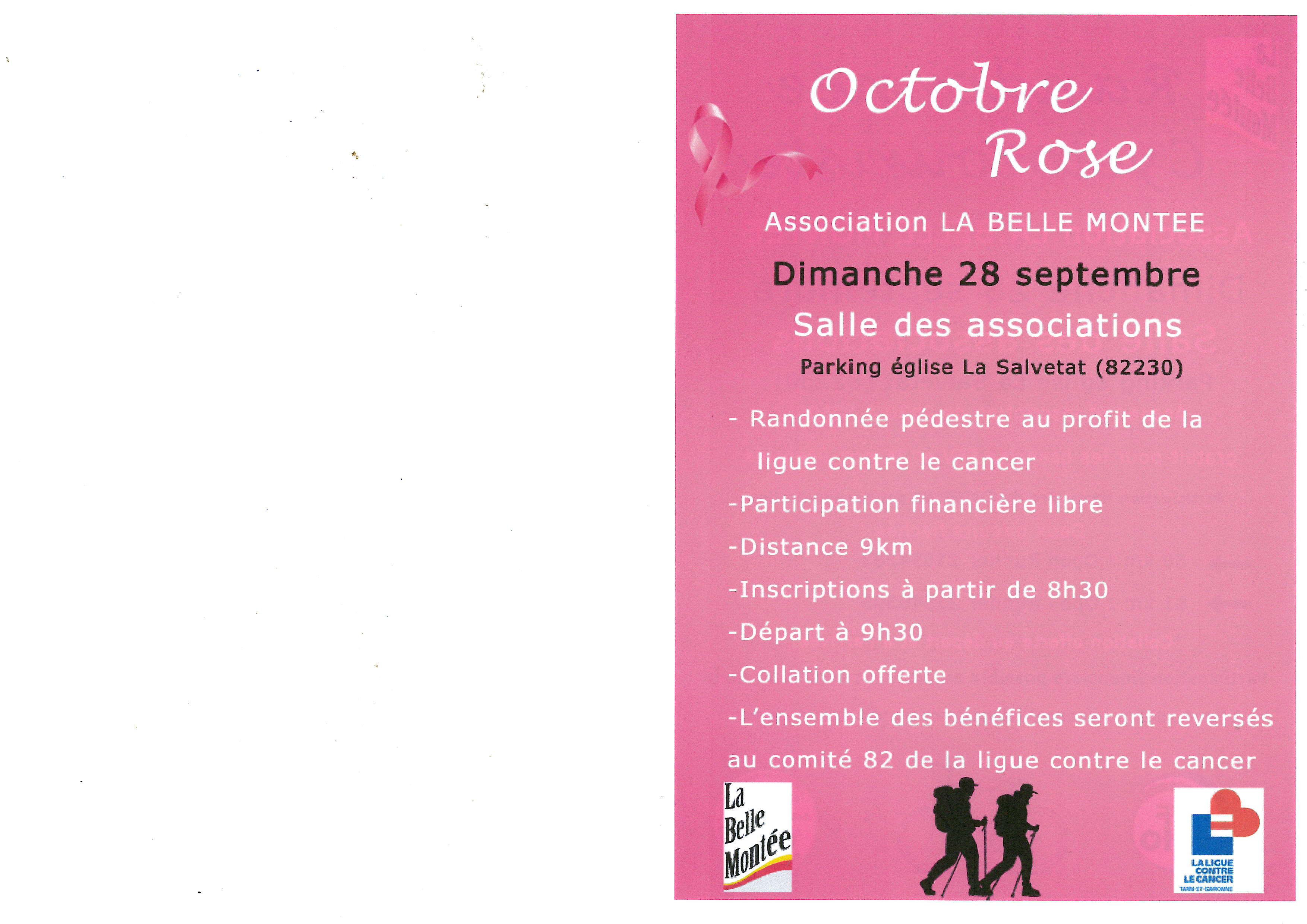 Randonnée octobre rose dimanche 28 septembre à partir de 9h30 salle des associations (parking église La Salvetat)