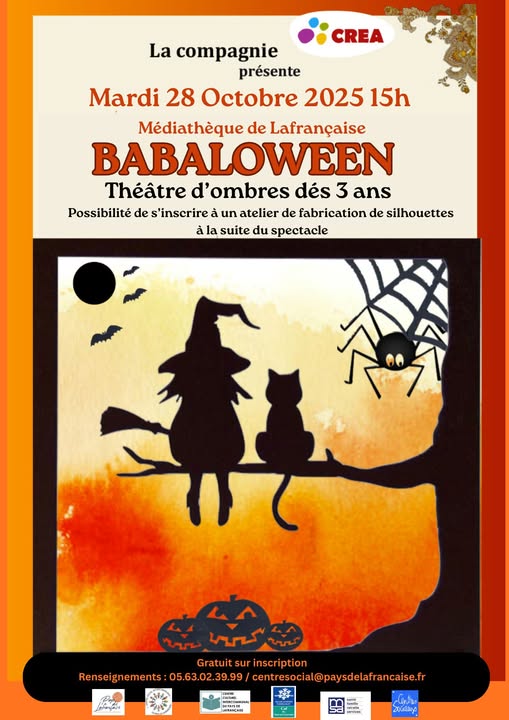 Mardi 28 octobre à 15 heures théâtre d'ombres "BABALOWEEN" à la médiathèque de Lafrançaise (dès trois ans)