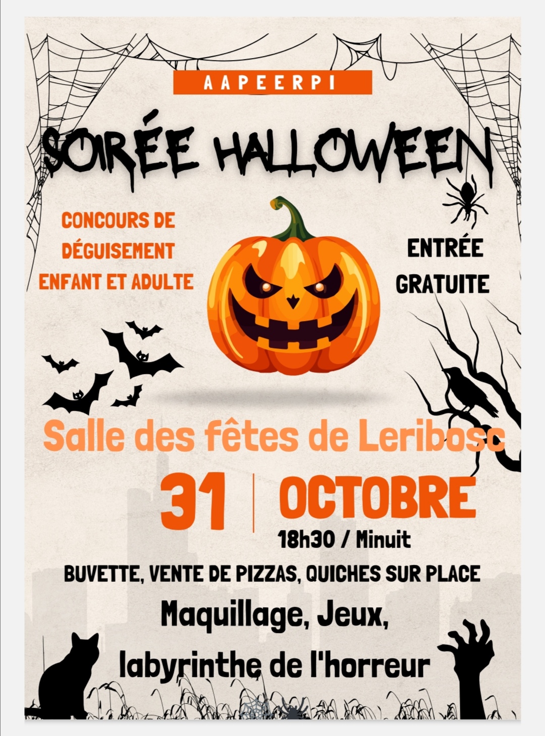 Organisée par les Parents d'Elèves du RPI, cette soirée se déroulera à la salle des fêtes de Léribosc le vendredi 31 octobre de 18h30 à minuit.