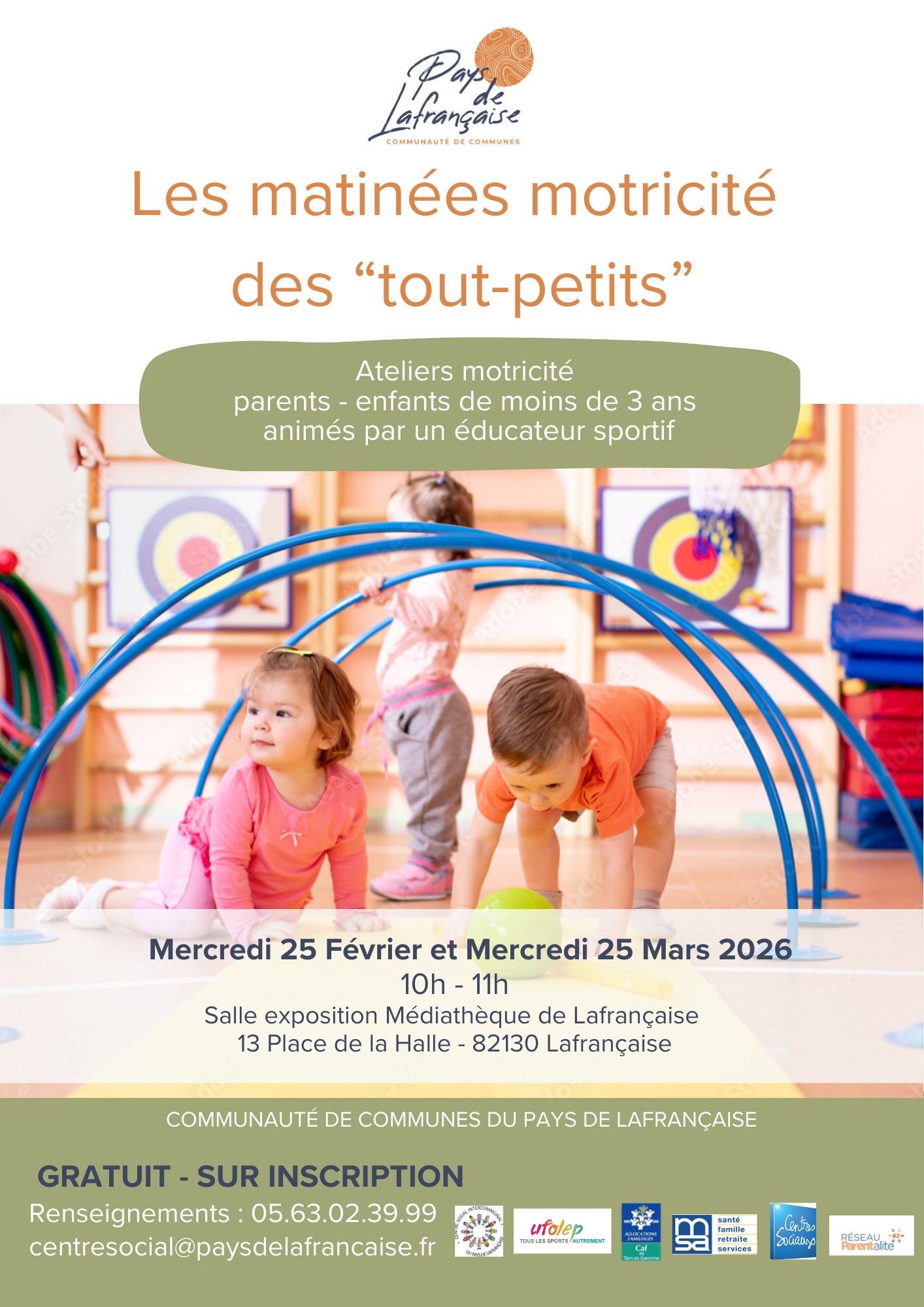 Pour rappel, le prochain atelier motricité parents-enfants de moins de 3 ans aura lieu mercredi 25 Février prochain à la Médiathèque de Lafrançaise.