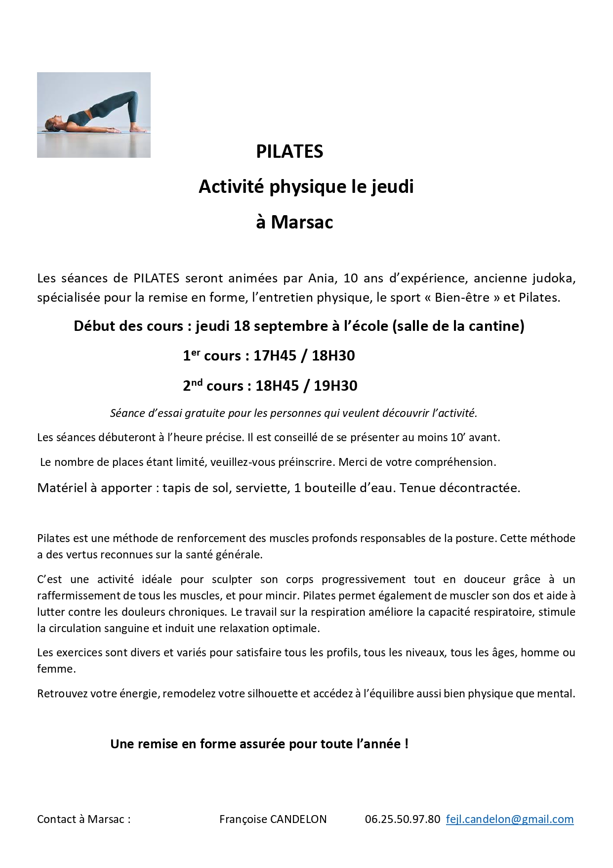 Des cours de pilates auront lieu sur la commune de Marsac tous les jeudis soirs.