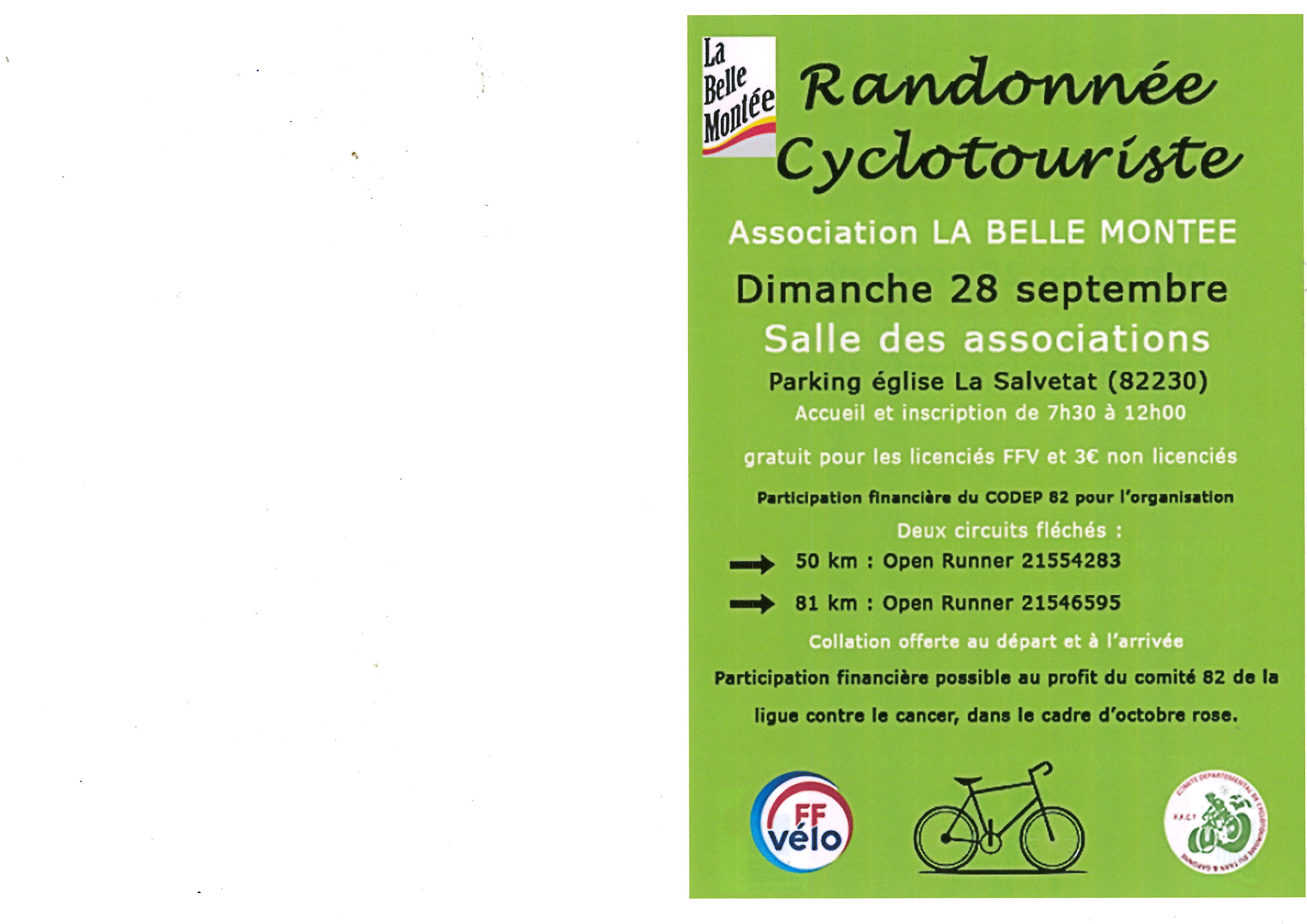 et randonnée Cyclotouriste salle des associations (parking église La Salvetat) accueil et inscriptions de 7h30 à 12h00 (gratuit pour les licenciés FFV et 3 € non licenciés) deux circuits fléchés(50 km et 81 km) collation offerte au départ et à l'arrivée.